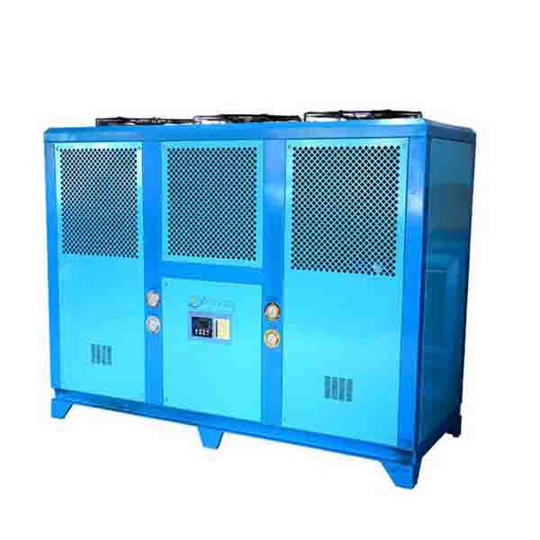 風冷式工業冷水機一般為整體機,及蒸發器、壓縮機和冷凝器做在一起。對于稍大功率的風冷式工業冷水機,則需要考慮其工作時冷凝器散熱風扇的散熱問題。在空調廠房里應用,整體機需要設置排風道將散熱風扇吹出的熱量引到室外。