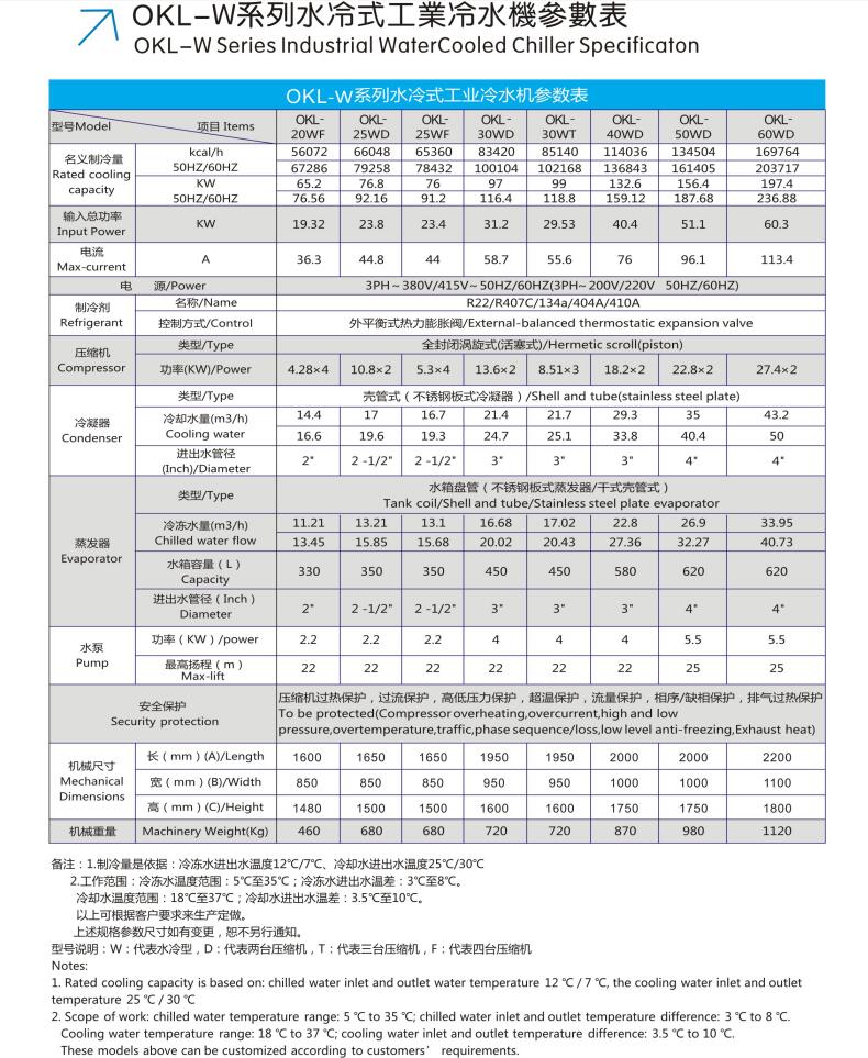 歐科隆制冷20匹水冷式冷水機是一款高效工業級制冷設備,專為大型生產及工藝冷卻需求設計,核心特點如下: